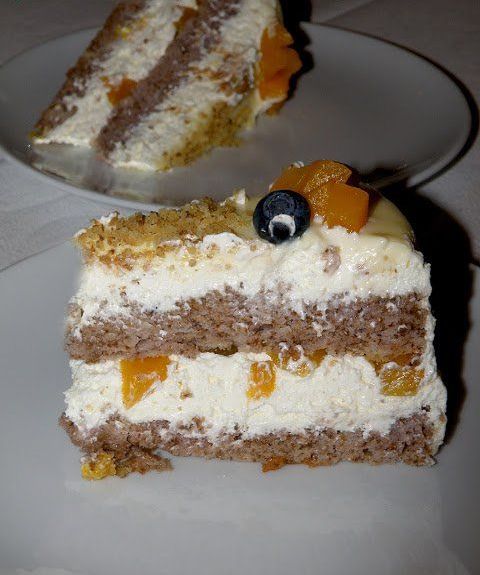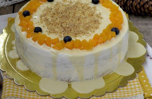 Торт очень легкий, с сочными ореховыми зефирами, нежным лимоном, кремом, сладкими персиками и ганашем из белого шоколада. Сочетание вкусов волшебно.