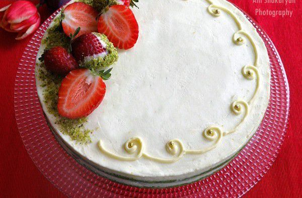 Торт очень стильный и изысканный — нежное сочетание фисташкового вкуса, свежей клубники и молочного крема из маскарпоне. Если вы предпочитаете более сочные торты, вы можете добавить сироп с подогретыми молоком, немного увеличить количество клубники и добавить к ним клубничный джем в середину.